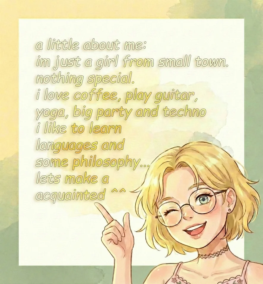 im just a girl from small town. nothing special. i love coffee, play guitar, yoga, big party and techno heheh i like to learn languages and some philosophy... lets make a acquainted ^^